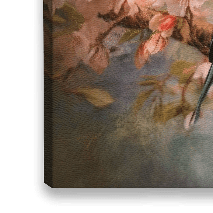Twee kleurrijke papegaaien zitten dicht tegen elkaar aan op een tak, omringd door zachte roze bloesem. Hun levendige kleuren en tedere houding geven dit kunstwerk een romantische en dromerige uitstraling. Perfect voor interieurs die natuur, liefde en een vleugje poëzie willen binnenhalen.