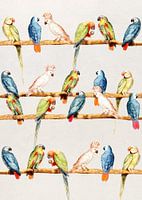 Handgeschilderde papegaaien in gecoördineerde felle kleuren op een neutrale beige achtergrond.