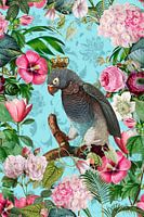 Papegaai met kroon omringd door weelderige bloemen