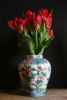 Rode papegaaitulpen in oud Hollandse Friese vaas.