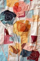 Vrolijk gekleurde collage van papieren bloemen, textiel en lijntekening.