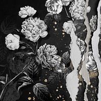 Een bijzondere combinatie: een collage van illustraties van bloemen met stukjes bladgoud en met gescheurd papier.
