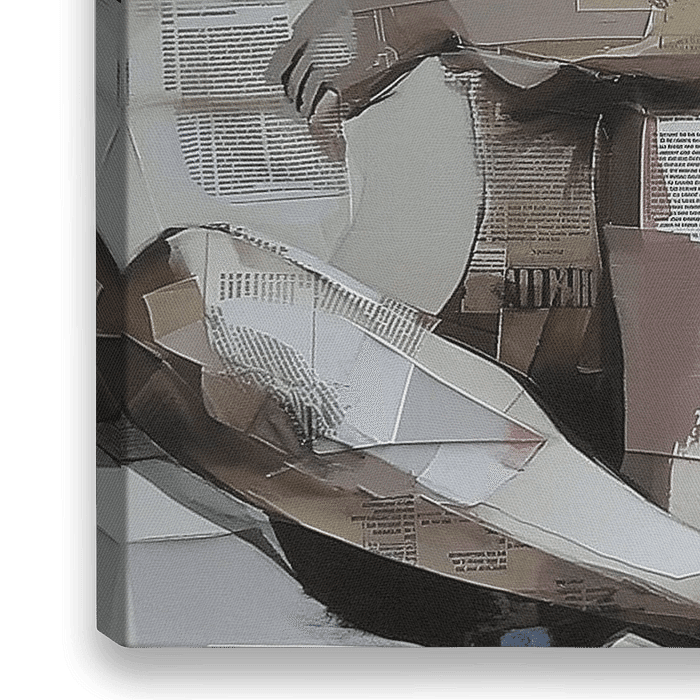 Mixed Media, gestileerde figuur dat is opgebouwd uit een collage van papierstukken, met een monochroom kleurenpalet dat reikt van wit en beige tot verschillende bruin tinten.
