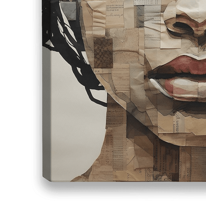Een collage van diverse papiersnippers, zorgvuldig gerangschikt om de gedetailleerde kenmerken van een gezicht te vormen. De texturen van kranten en verschillende documenten zijn verweven, waardoor een tapijt van verhalen ontstaat. De ogen, die diepte uitstralen, zijn met uitzonderlijke detail weergegeven, en nodigen de kijker uit om na…