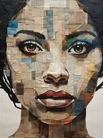 Een collage van diverse papiersnippers, zorgvuldig gerangschikt om de gedetailleerde kenmerken van een gezicht te vormen. De texturen van kranten en verschillende documenten zijn verweven, waardoor een tapijt van verhalen ontstaat. De ogen, die diepte uitstralen, zijn met uitzonderlijke detail weergegeven, en nodigen de kijker uit om na…