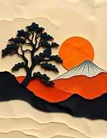 Dit fascinerende beeld heeft een gestileerd landschap dat is opgebouwd uit lagen papier, waardoor een opvallend driedimensionaal effect ontstaat. Een silhouet van een boom met vol, rond gebladerte staat prominent op de linker voorgrond, de donkere vorm steekt af tegen de warme tinten van de opkomende (of ondergaande) zon die is afgebeeld als een levendige oranje cirkel rechtsboven. De zon werpt een zachte gloed op de horizon, voorgesteld door gelaagde oranje en zwarte heuvels die zich in de verte terugtrekken. Aan de rechterkant van de compositie domineert een majestueuze bergtop, waarvan de besneeuwde top is weergegeven in lichtgrijs en wit, wat diepte en grandeur toevoegt aan de scène. Het kleurenpalet is warm en uitnodigend, met zachte beige tinten in de lucht en op de voorgrond die de textuur van het papier versterken. De afbeelding roept een gevoel van rust en de schoonheid van de natuur op door het eenvoudige maar elegante ontwerp.