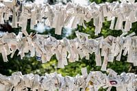 Papieren gebeden bij Daisho-in, een boeddhistische tempel aan de voet van Mount Misen in Japan. Uit dit lichte beeld met de geknoopte papieren gebeden spreekt hoop en verlangen.