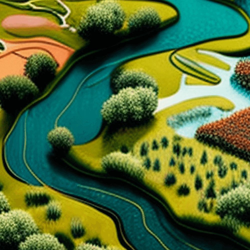 Ein gewundener, tief blaugrüner Fluss dominiert die Komposition und schlängelt sich anmutig von rechts oben nach links unten. Entlang seines Verlaufs zweigen kleinere Kanäle und Nebenflüsse ab, die oxbowartige Schleifen und sanft abfallende Auen bilden. Die Ufer sind von Gruppen rundlicher, hellgrüner Sträucher und Bäume unterbrochen, deren Formen zu weichen, gepunkteten Hügeln stilisiert sind, die auf dichtes Laubwerk hindeuten.
