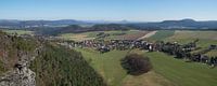 Uitzicht vanaf de Papststein in de richting van het dorp Papstdorf en het Elbezandsteengebergte. Landschapspanorama met zandsteenrotsen en velden in Saksisch Zwitserland. Natuurfotografie en wandelervaring in Oost-Duitsland.