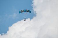 Parachutisten in een dubbelsprong aan en parachute tegen een blauwe lucht met wolken