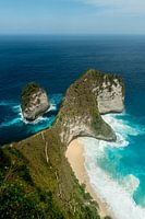 Wit strand, blauwe zee bij het strand 'Kelingking beach'. Landschapsfotografie. Eiland en strand leven op het eiland Nusa Penida, van Bali, Indonesië.