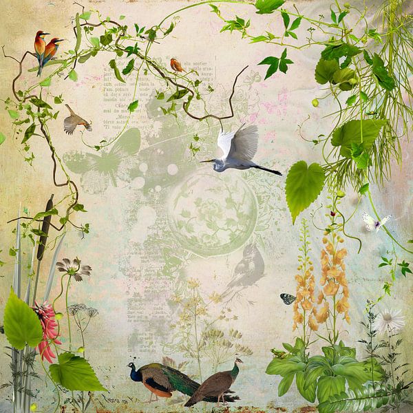 Gemaakt door veel lagen met bloemen, planten, vogels te verwerken.