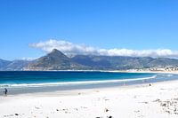 Een wit strand met een baai en bergen op de achtergrond. Een waar paradijs onder een strak blauwe lucht. Een enkele wandelaar op het strand en in de verte wat huizen. Dit is het strand van Kommetjie nabij Kaapstad, Zuid-Afrika.