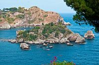 Een kilometerslange kustlijn met een dynamische, rotsachtige kustlijn en uniek, schoon, turquoise gekleurd zeewater slingert zich een weg langs de baai van Taormina.