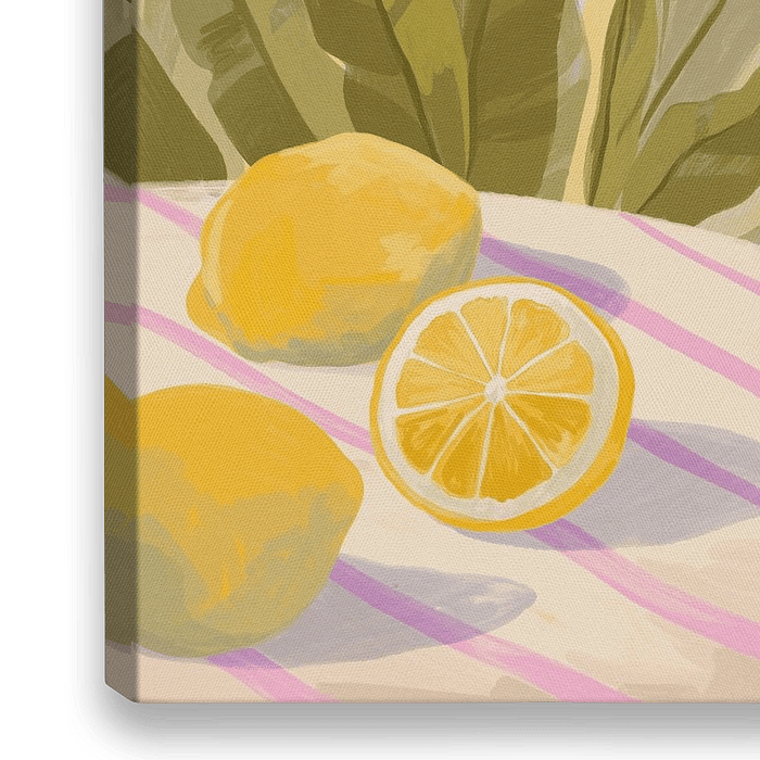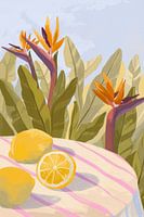 Een stilleven van citroenen op een tafeltje met wit met roze tafelkleed. Op de achtergrond is de 'Birds of Paradise' plant te zien.