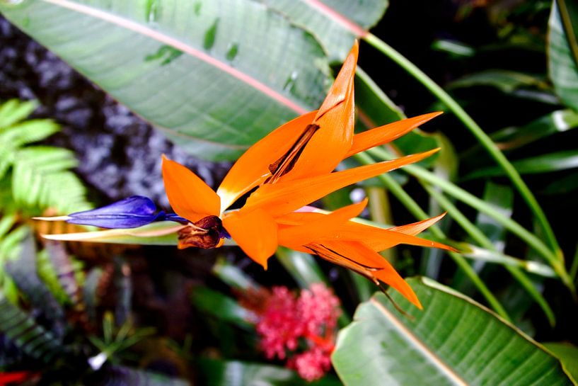 Door zijn felle kleuren valt de Paradijsvogelbloem goed op.
