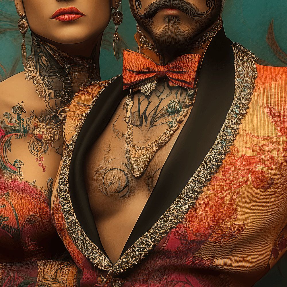 In de portretten worden de stellen niet slechts afgebeeld als mode-iconen, maar als levende kunstwerken, volledig omarmend hun eigen excentrieke charme. Ze dragen kleding die narratief is: geen simpele jurk of pak, maar iconische ontwerpen die hun karakter en levensstijl weerspiegelen. Van weelderige zijden stoffen tot gouden en fluwelen accenten, de materialen zijn zorgvuldig gekozen om de extravagantie en verfijning van hun wereld uit te drukken. De AI maakt het mogelijk om ongekende details en subtiele nuances in de stofweefsels te creëren, zoals de zachte glans van zijde, het diepe, rijke oppervlak van fluweel, en de delicate, ingewikkelde patronen die de luxe van hun kleding versterken.