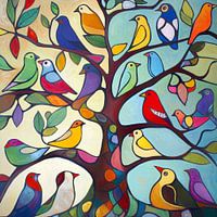 Kleurrijke vogels van verschillende soorten zitten op de takken van een gestileerde boom, elk afgebeeld in heldere kleuren. De compositie creëert een levendig en speels tafereel waarin bladeren en vogels een harmonieus patroon vormen.