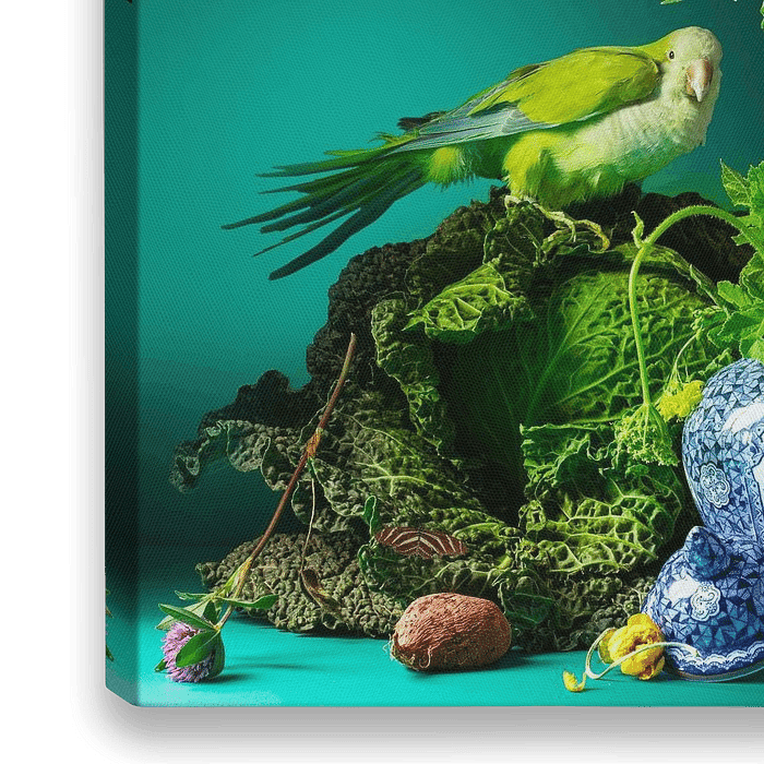 Stilleven verticale foto van een groene kool met een grote parkiet en een pot met deksel van Villeroy en Boch. In de pot zit fluitenkruid, zuring en rode klaver. Alles tegen een diepgroene achtergrond. Het geheel ademt een alternatief klassieke sfeer.