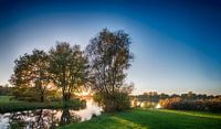 Op de foto is de zon verscholen achter de bomen en het windstille weer doet de bomen mooi spiegelen in het water van de Leeghwaterplas in Almere. Wat een paradijselijk plaatje! De foto straalt een serene rust uit en is om die reden zeer geschikt voor aan uw wand!