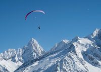 Een paraglider zweeft boven de besneeuwde toppen van de Aiguilles de Chamonix in de Franse Alpen.