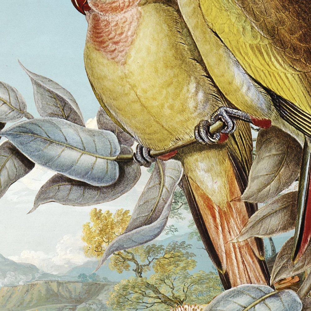 "The River Severn at Shrewsbury, Shropshire" geschilderd in 1770 door de Engelse landschapschilder Paul Sandby (1731-1809), Londen & "The Princess of Wales Parakeets Polytelis Alexandrae" een illustratie door de Engelse kunstenares Elizabeth Gould (1804-1841).