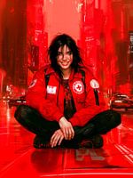 Een jonge vrouwelijke paramedicus zit in kleermakerszit op de grond en draagt een rode jas met witte emblemen en een medische patch. Ze heeft donker haar. Rode achtergrond.