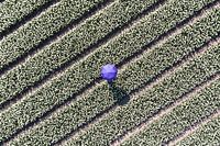 Met een paarse paraplu in het midden van de bollen velden. De paarse kleur steek mooi af tegen de witten tulpen.