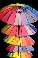 Vele kleurrijke paraplu's in de kleuren van de regenboog hangen voor een donkere achtergrond in staand formaat
