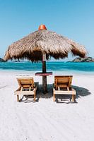 Een parasol met ligbedjes op het strand van Tanjung Aan in Lombok (Indonesië).