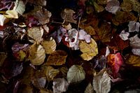 Mysterieuze sfeerfoto van gekleurde herfstblaadjes met druppels in de natuur van de White Mountains, de bergen in Noord-Amerika. Mystiek sfeerbeeld voor bijvoorbeeld in de woonkamer of slaapkamer.