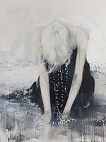 Parelvrouw | Pearled Silence - Dit vrouwen schilderij toont een zittende vrouw met lange, vloeiende witte haren tegen een achtergrond van abstracte grijze en blauwe tinten, waarbij opvallende witte parels verspreid over haar donkere kleding zijn.