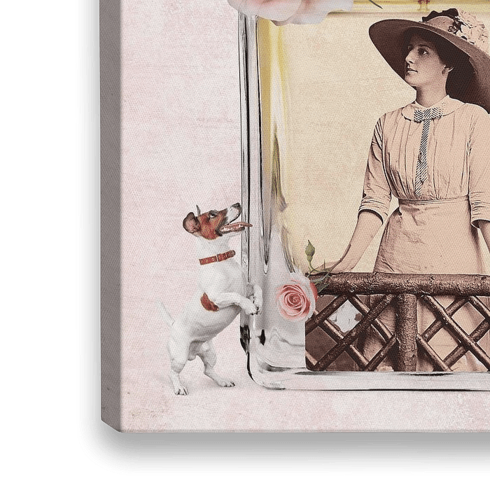 Een Parisienne in een vintage look die op haar geliefde staat te wachten bij de metro. Vol verlangen leunend tegen een hekje met een roze roos in haar hand, hopende alvast een glimp op te kunnen vangen.