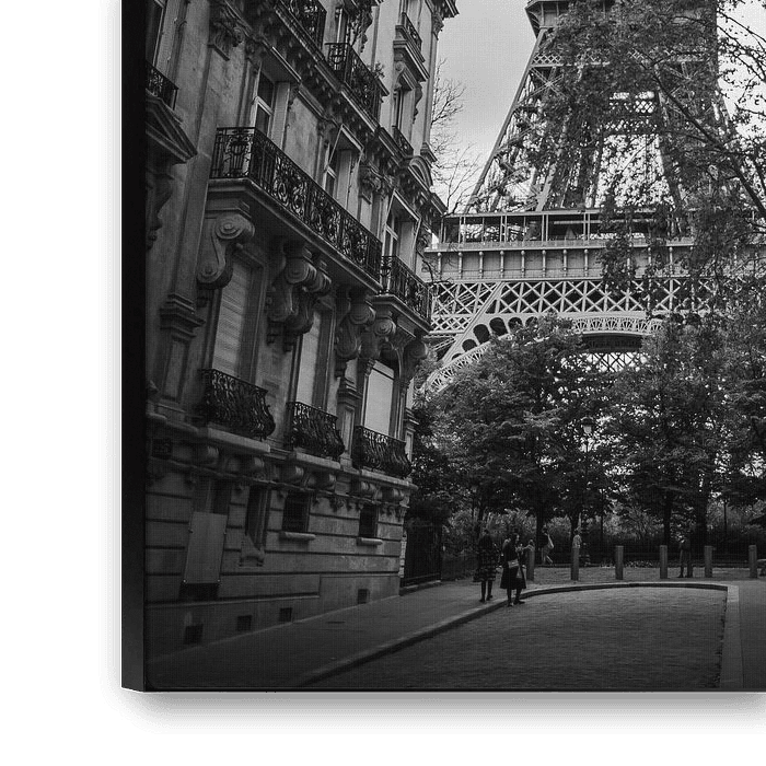Zwart wit foto Eifel toren in Parijs vanuit frans straatje.