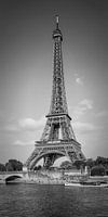 De Eiffeltoren in Parijs, 324 meter hoog, domineert het stadsbeeld. Het is een van de meest bezochte bezienswaardigheden ter wereld. Hier is een typisch uitzicht op de Eiffeltoren. Klassieke monochrome indruk van de oevers van de Seine in verticaal panoramaformaat.