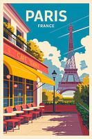Een magisch panorama ontvouwt zich in de zonnige sfeer van een Parijs café. De iconische Eiffeltoren rijst majestueus op boven het tafereel, terwijl kleurrijke stoelen de gasten opwachten voor het uitnodigende terras. Stralen van blauwe lucht en zachte wolken laten de tijdloze elegantie van deze stad opbloeien en beloven dromen en plezier.