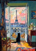 Dit impressionistische olieverfschilderij toont een zwarte kat die op de vloer van een Parijse flat zit en door grote ramen naar de Eiffeltoren en een pastelroze zonsondergang kijkt. Kleurrijke patronen en meubels in de kamer creëren een warme, uitnodigende sfeer. Met levendige kleuren, zachte penseelstreken en impressionistische techniek legt het werk de harmonieuze balans vast tussen stedelijke architectuur, gezellige interieurs en de vredige aanwezigheid van de kat. Ideaal voor liefhebbers van impressionistische kunst, kleurrijke interieurs en de romantische sfeer van Parijs.