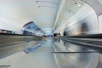De spiegeling in de lichte tegels en op de stalen scheiding tussen de twee loopbanden in deze Metro van Parijs en de ovalen tunnel. Het is ongelofelijk hoeveel meters je op deze manier in Parijs ondergronds aflegt.