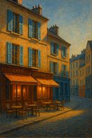 Het gouden ochtendlicht strijkt over de geplaveide straten van Montmartre, omarmt elke stenen gevel, elk luikraam en elk gefluister van de avondlucht van gisteren. Het kleine Parijse café op de hoek gloeit met een zachte amberkleurige gloed, de lampen branden nog terwijl de zon opkomt achter de daken. Lege tafels wachten in stille…