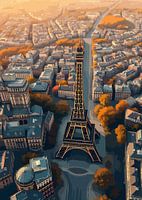 Zweef boven de Lichtstad met deze prachtige luchtfoto van Parijs. De Eiffeltoren rijst op in warme herfsttinten en legt de romantiek en elegantie van Frankrijk vast in een gedurfde illustratiestijl. Perfect voor liefhebbers van reizen en tijdloze architectuur.