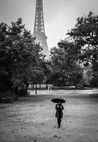 Een jongedame met een paraplu met de Eiffeltoren op de achtergrond
