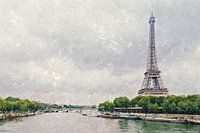 Digitaal kunstwerk van 2 highlights van Parijs, de Eiffeltoren en de Seine.