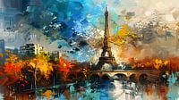 Een levendige en abstracte afbeelding van Parijs, met de Eiffeltoren als middelpunt. De toren rijst op te midden van een chaotische mix van kleuren, voornamelijk blauw, geel en oranje, wat een dynamische sfeer suggereert. Rondom de toren zijn gebouwen, bomen en een rivier te zien, allemaal weergegeven in een schilderachtige stijl. De…