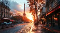 De bladeren van de bomen zijn goud gekleurd door de zon, en de Eiffeltoren staat in de verte als een stille getuige van de ontwakende stad.