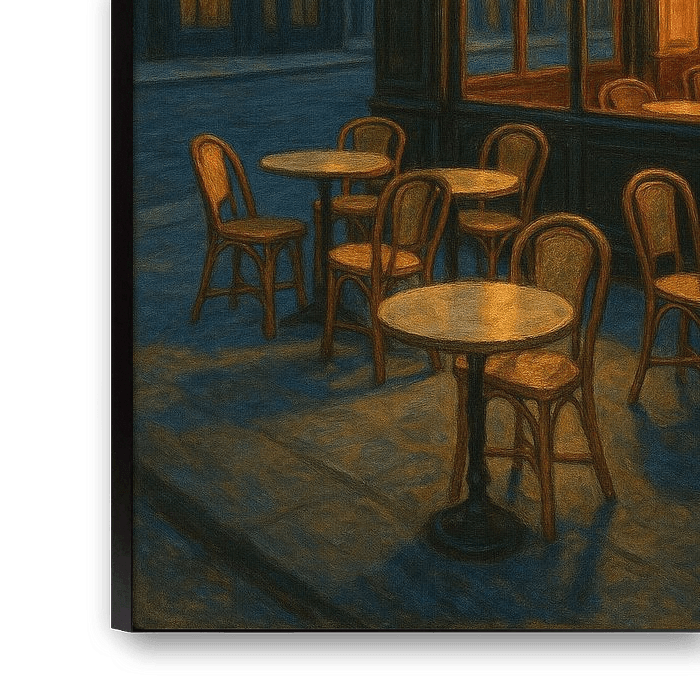 Parisian Café Twilight is een portret van intimiteit en afstand - de stille schoonheid van een café nadat de drukte voorbij is. Het warme licht van binnen valt over het trottoir en raakt de lege stoelen met een melancholische tederheid. De wereld buiten verdiept zich in blauw, het uur tussen dag en nacht. De kunstenaar kanaliseert Edward Hopper's fascinatie voor ramen, eenzaamheid en de dialoog tussen licht en schaduw en vertaalt deze naar de taal van Parijs.