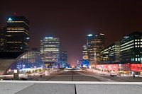 Het zakendistrict Paris La Defense rond middernacht, gezien vanaf de Grande Arche richting Arc de Triomphe, op de historische as van Parijs. Links het excentrieke ronde gebouw CNIT.