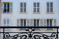 Het lijnenspel van de ramen met luiken en het balkon geef een mooi contrast.