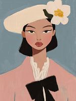 Dit elegante portret combineert zachte kleuren met een zelfverzekerde houding en een subtiele knipoog. De baret zit perfect, de strik is precies groot genoeg en haar blik laat zich niet haasten. Dit is geen decoratie die om aandacht vraagt, dit is kunst die aandacht krijgt.