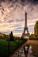 De Eiffeltoren weerspiegeld in een plas water. Na een regenachtige dag is het goed vertoeven in het park rond de Eiffeltoren. Op elke hoek zit wel een artiest zijn kunstwerken te vertonen. Tegen de bwolkte lucht met hier een daar wat blauwe plekken steekt dit symbool van Parijs mooi af. Gefotografeerd door Michiel Buijse.