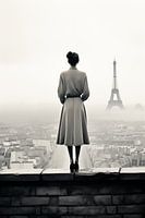 A woman standing on top of a roof, looking at the Eiffel tower in Paris. Black and white photography.